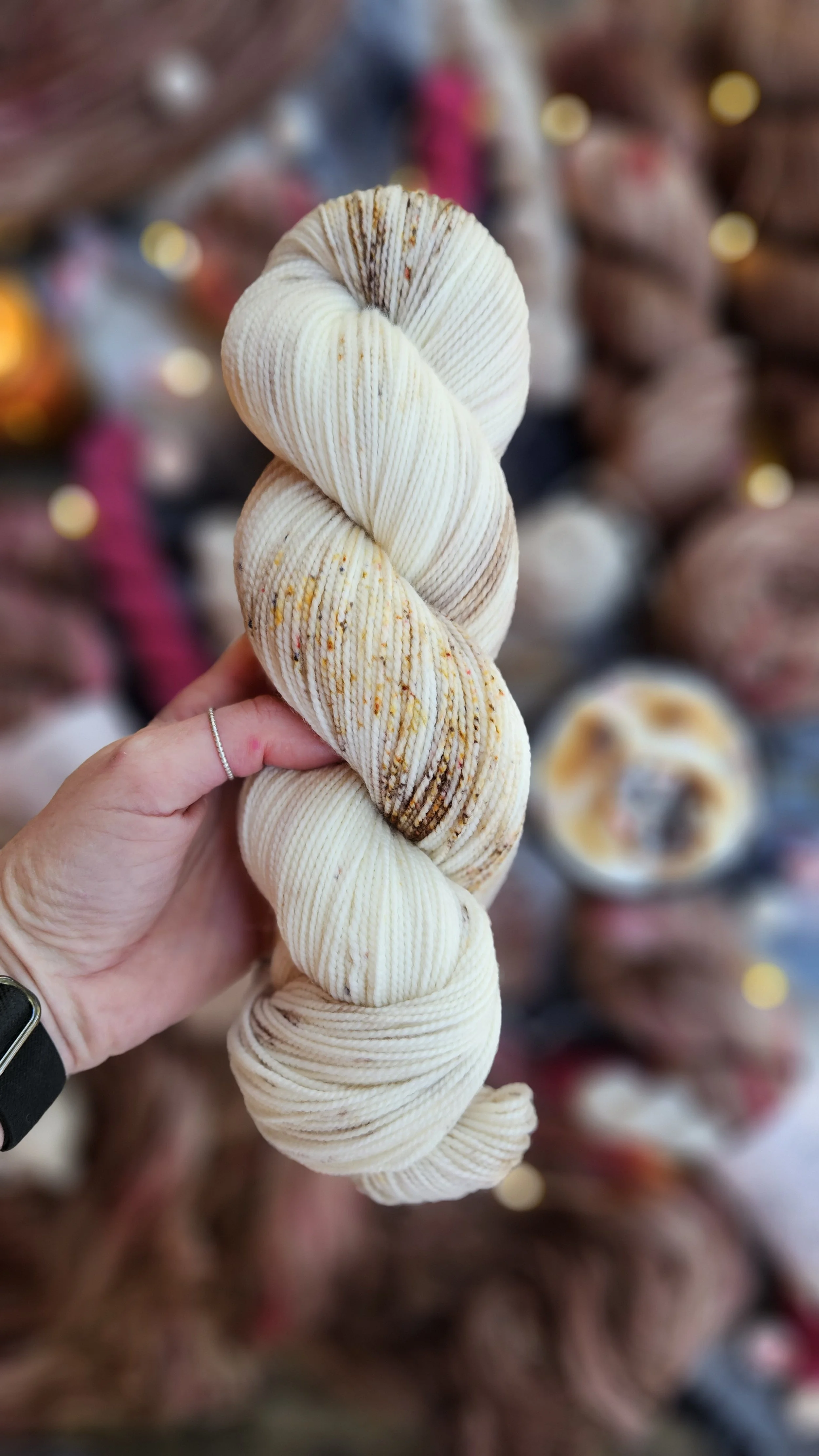 Creamy white with bits of golden yellow and a touch of brown- perfectly toasted over the fire!